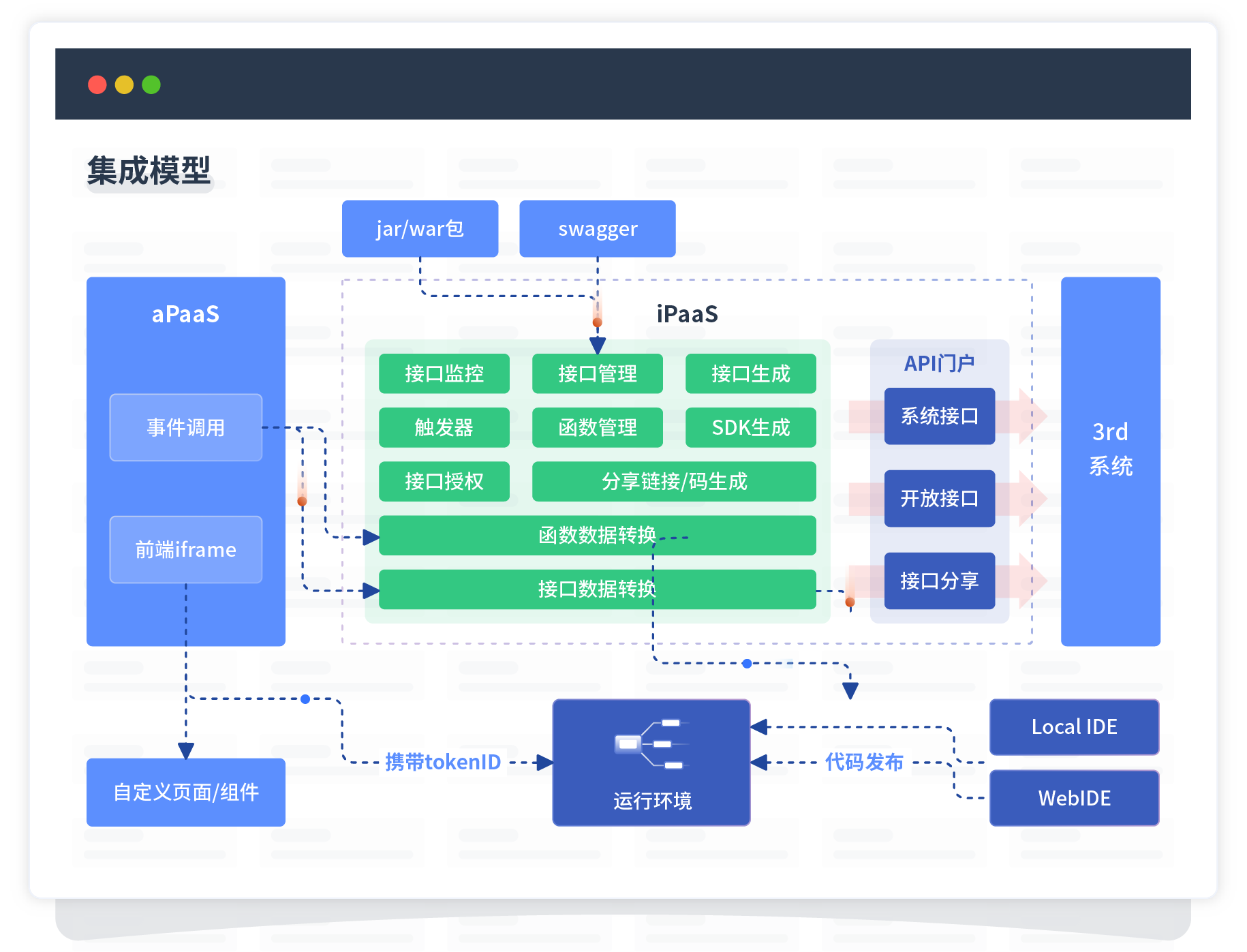 集成模型包括平台本身前、、、、、、、、、、后端能力的扩展,,,,,,,,,,,,,,也支持通过API门户和第三方系统进行交互。。。。。。。。。。。