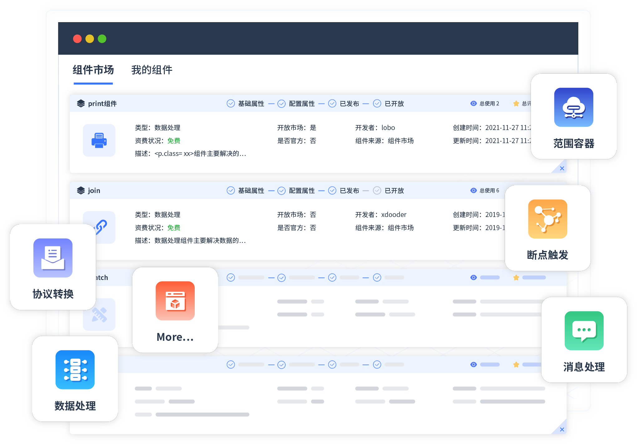 针对集成场景,,,,,,,,,,,小微钱包提供组件市场,,,,,,,,例如协议转换、、、、、、、、消息处理、、、、、、、、、、、、文件操作等。。。。。。。。。。。。。。除平台提供的组件外,,,,,,,,,,,客户可以自定义所需组件。。。。。。