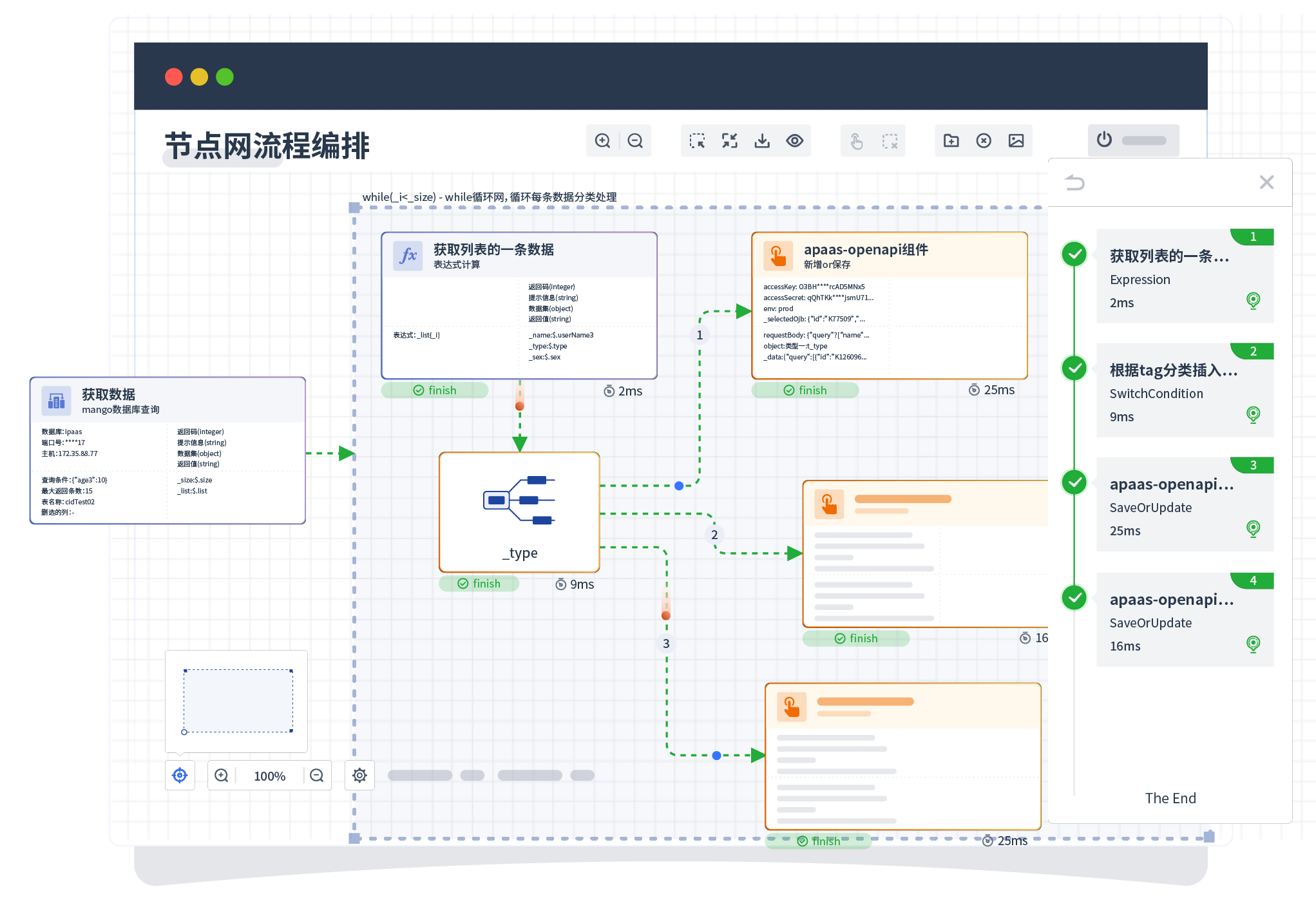 针对集成场景,,,,,,,组件定义后支持进行流程编制,,,,,,,,,,,,不同于传统代码方式,,,,,,,通过图形化展示,,,,,,,,,,支持在线调试、、、、、、、、、日志查看和运行回放。。。。。。。。