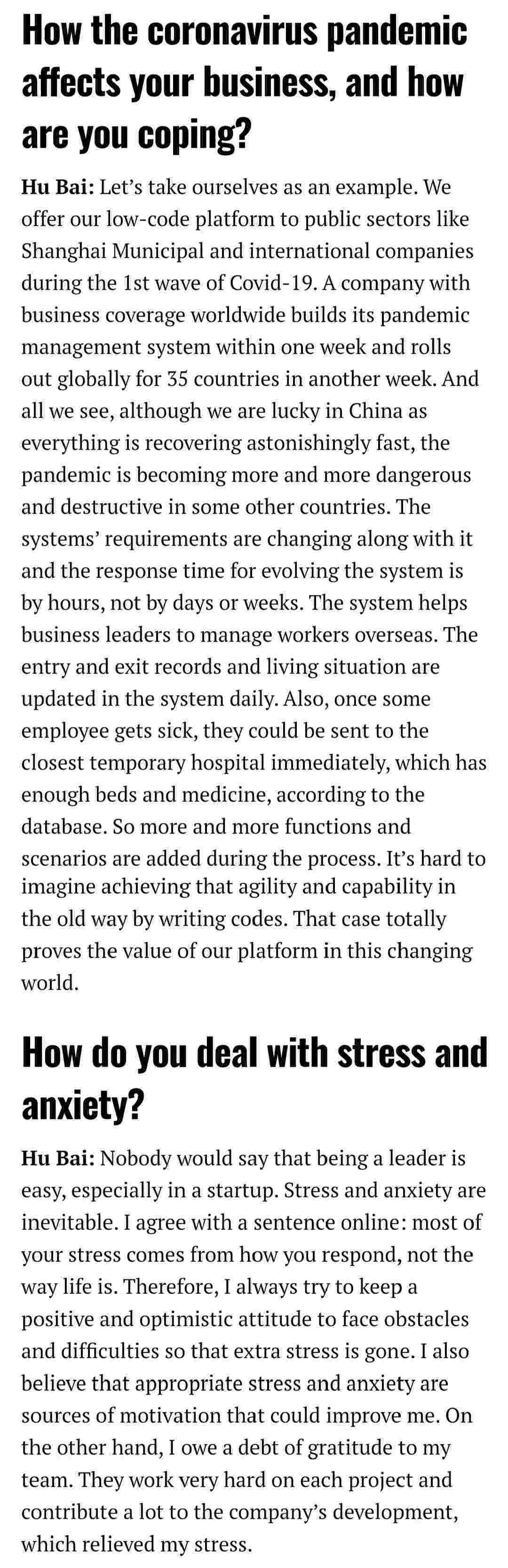 2021年年初,,,,,,,爱湃斯科技CEO胡柏受邀接受法媒Startup.info的专访,,,,,,,,与Startup info的读者分享了自己的创业经历、、、、、、、、、以及低代码平台小微钱包的创新之处。。。。。。。。。。