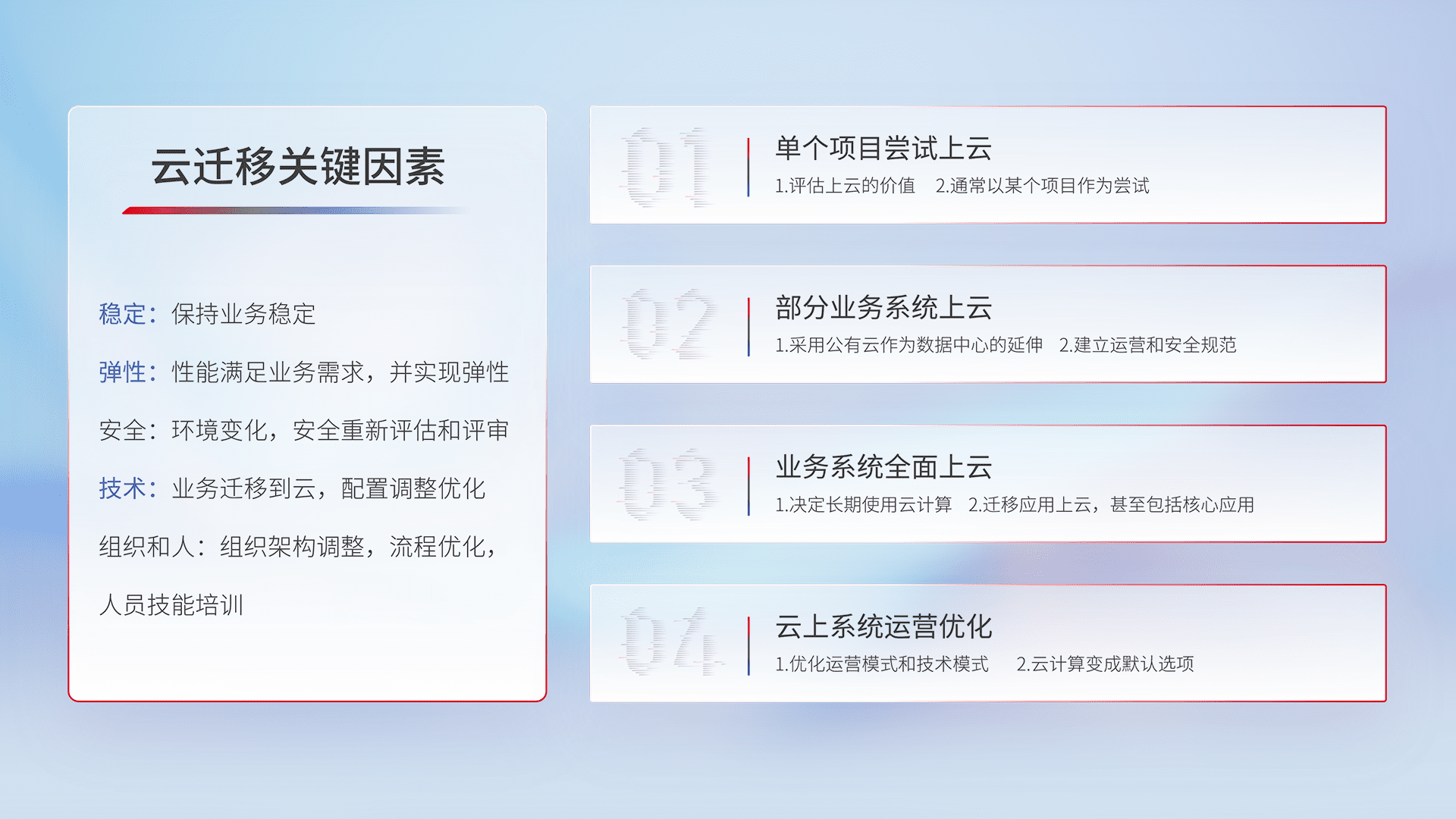 结合实际业务,,,从规划设计、、云平台选型、、、、云原生改造、、、数据迁移、、、、集成交付,,,迁移全过程为客户识别最佳上云路径,,做好风险识别管理,,,设计网络架构、、身份权限、、、、安全审计合规、、、、操作审计、、、日志审计、、监控告警策略、、、多站点容灾设计等,,,对云上基础设施进行整体规划,,,,提升IT治理水平,,,,以满足弹性、、、、高可用、、高性能的需求。。。