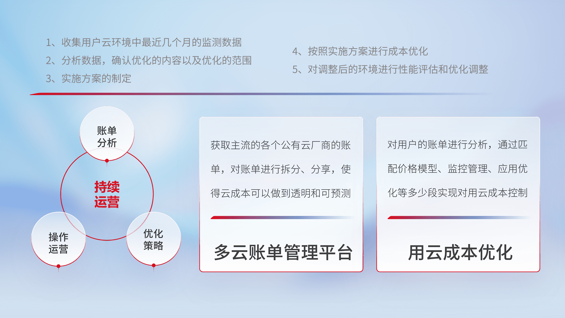 通过灵活运用多种自动化迁移工具,,,帮助企业用户实现业务和数据高效 、、、稳定的上云迁移和云上迁移,,采用自研多云纳管平台,,,,以中立管理模式,,解决多组织、、、、多云、、多运维厂商的复杂关系的管理,,,,保证多云平台资源配置的一致性,,实时掌控云资源运行数据,,,,运用智能化工具分析云资源多云平台的管理服务,,透明化管理成本支出,,,,用云成本可预测、、用云费用可优化、、、云资源配额有据可依。。。