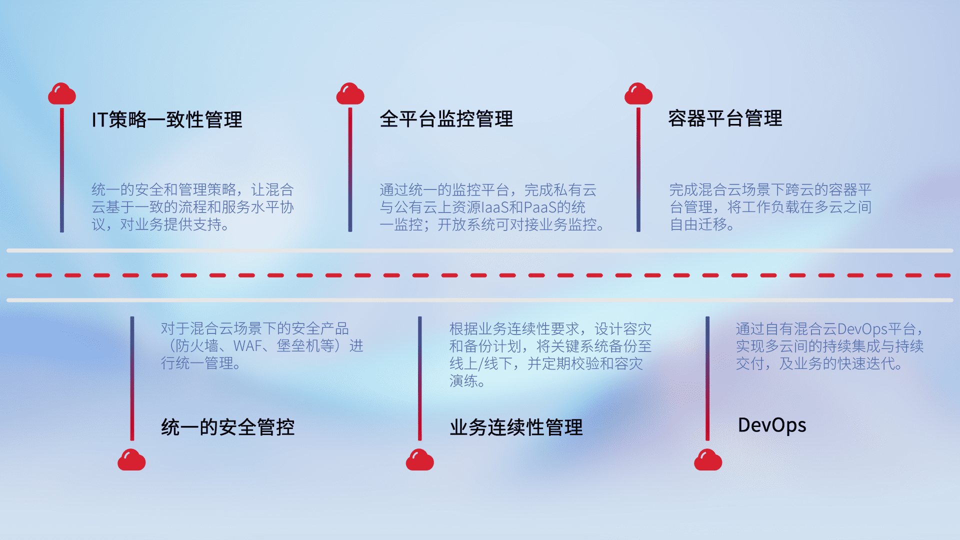 通过多云纳管,,,,以统一的资源数据模型把客户的云资源进行抽象和封装,,,,进而实现对多云资源的统一操作,,保障云资源管理的可靠性、、稳定性与可用性。。。量身定制化运维内容,,,配置、、开发运维、、补丁管理、、、、备份、、监控、、、认证和访问管理、、、、审计和日常巡检等,,保障在用云过程中的可靠度,,,,稳定度以及高可用率。。。